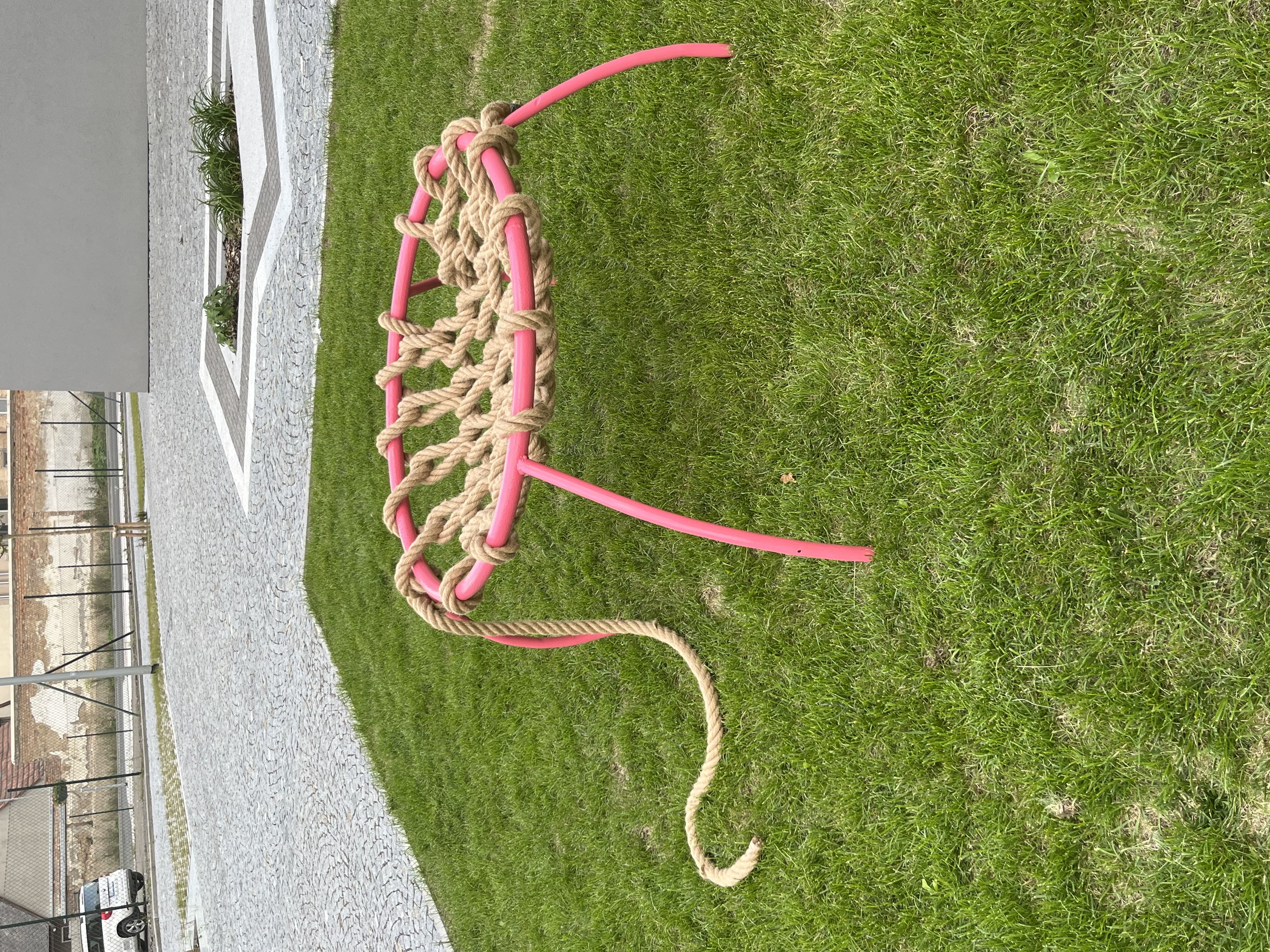 The structure is made out of reused rebar from construction sites and thick hemp rope. By knitting the rope and attaching it to the rebar, we reference the old practices of Perla. The sculpture is interactive as you can climb on it, hang in it and walk under it, making the sculpture a part of the culture of Ústí. It currently sits in front of Perla and a leisure center for kids.
